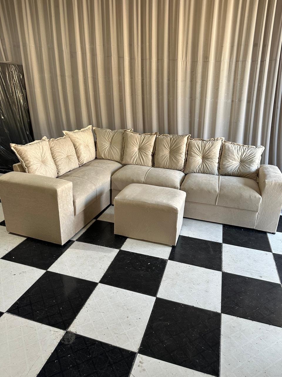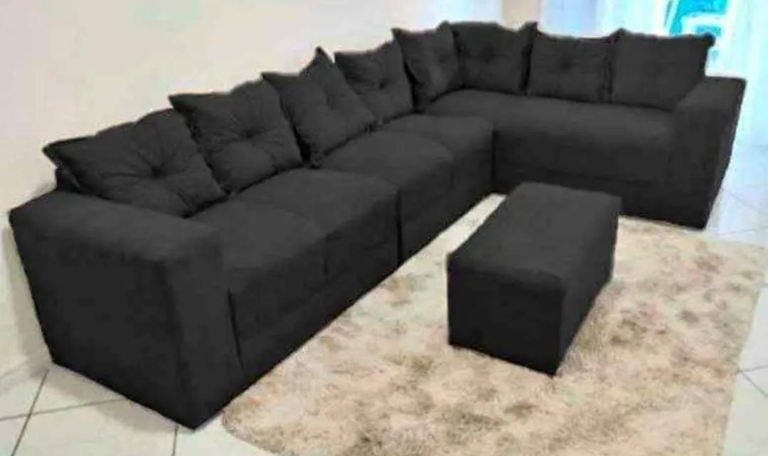 Encosto fixo e almofadas soltas de espuma.